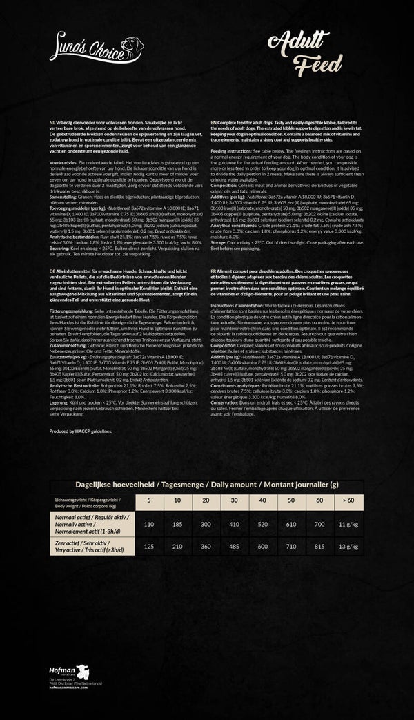Cet aliment complet de Luna's Choice a été spécialement conçu pour les chiens adultes. Les croquettes savoureuses et faciles à digérer sont adaptées aux besoins des chiens adultes. Les croquettes extrudées favorisent la digestion et sont pauvres en matières grasses, ce qui permet à votre chien de conserver une condition physique optimale. Les croquettes contiennent un mélange équilibré de vitamines et d'oligo-éléments qui contribuent à la brillance du pelage et à la santé de la peau.