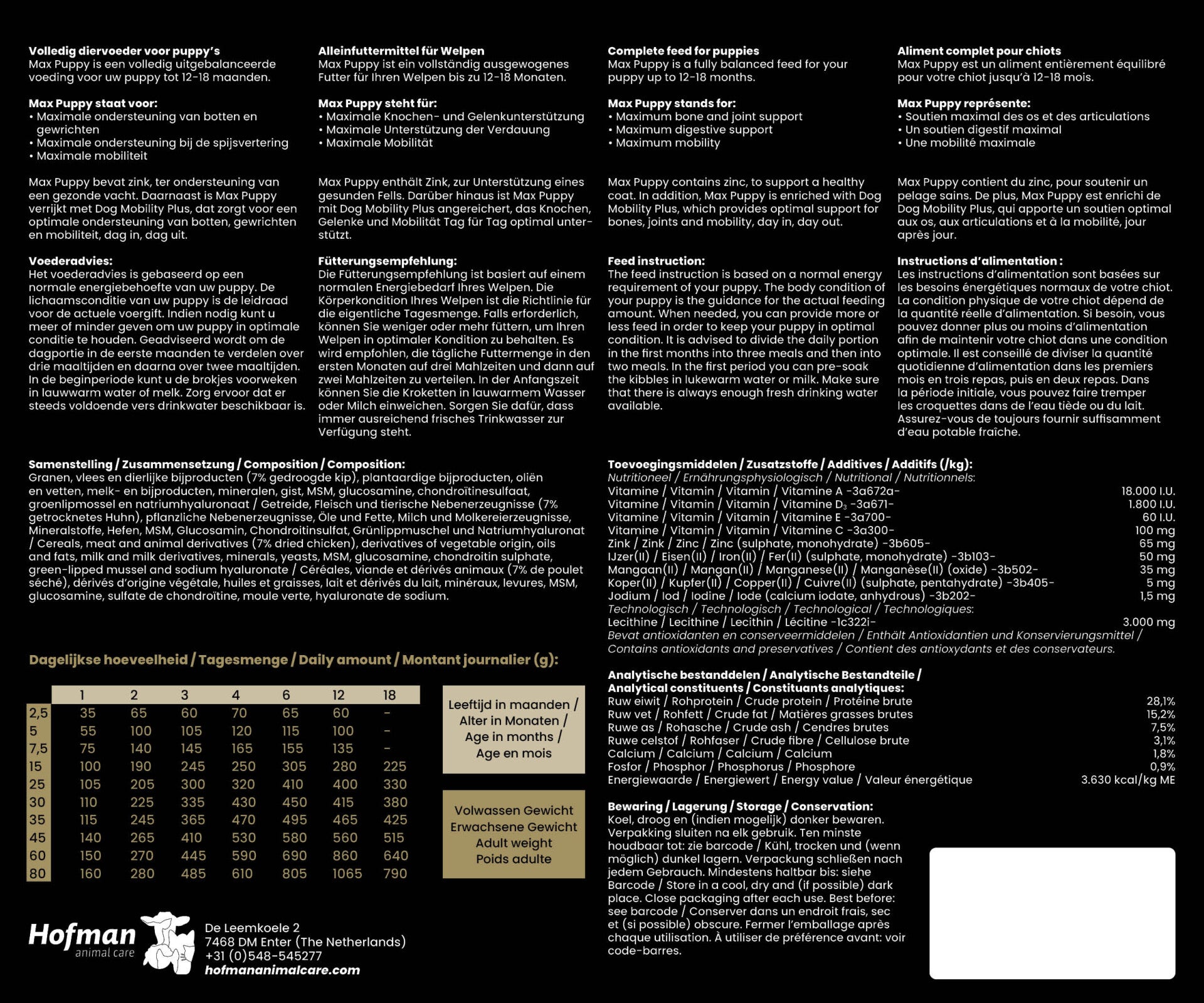 Max Puppy est un aliment Super Premium Plus sous forme de granulés et contient des ingrédients de haute qualité. Grâce à l'ajout du complément alimentaire Dog Mobility, Max Puppy est l'aliment le plus complet pour chiots. Dog Mobility veille à ce que la mobilité et le développement du squelette soient soutenus de manière optimale.