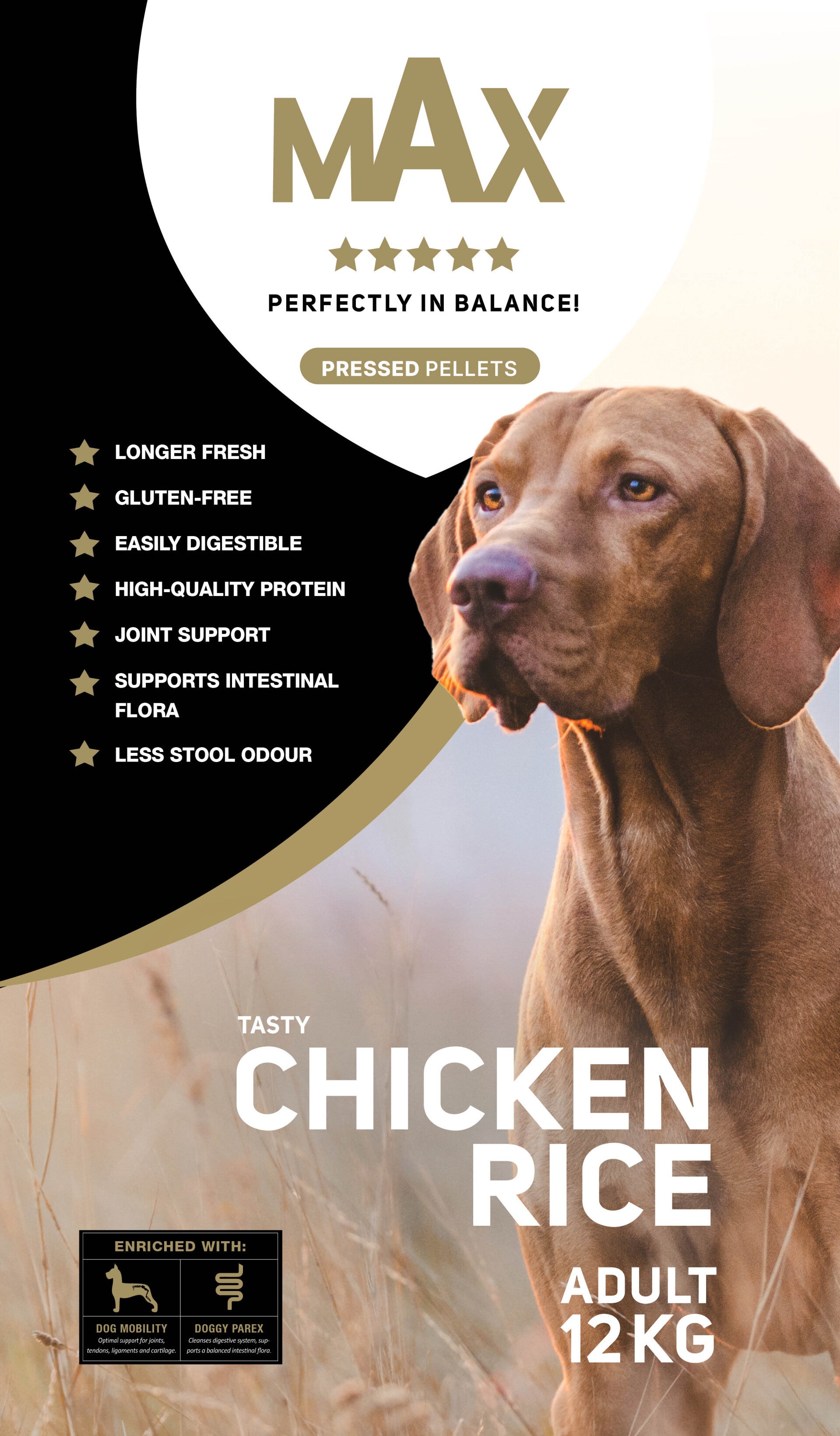 Max Adult Poulet et riz en morceaux pressés est un aliment 5 étoiles entièrement équilibré pour chiens adultes sous forme de croquettes pressées. Il aide les chiens adultes à rester parfaitement équilibrés. Cet aliment est enrichi de 2 de nos aliments complémentaires, à savoir Dog Mobility et Doggy Parex.