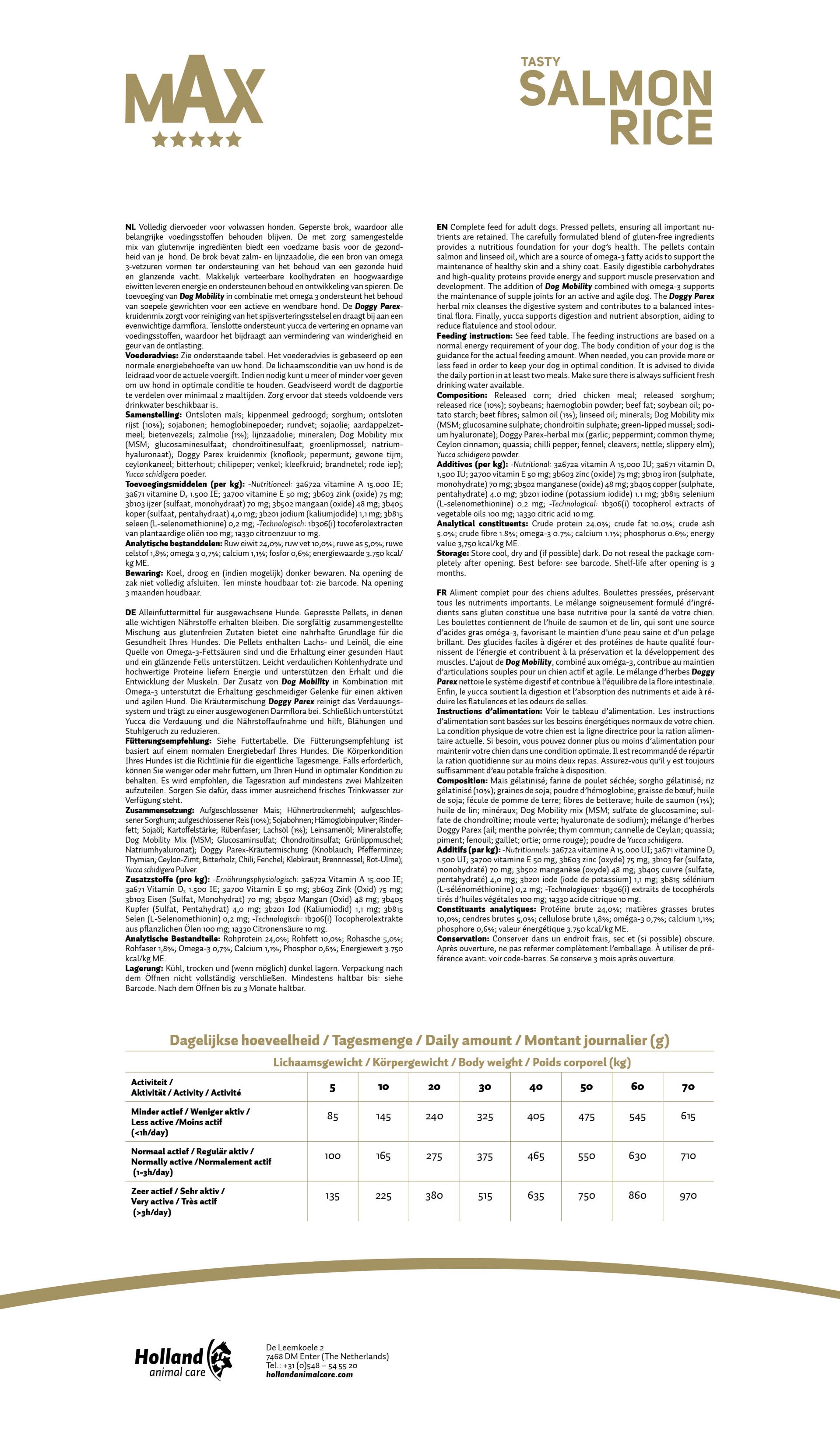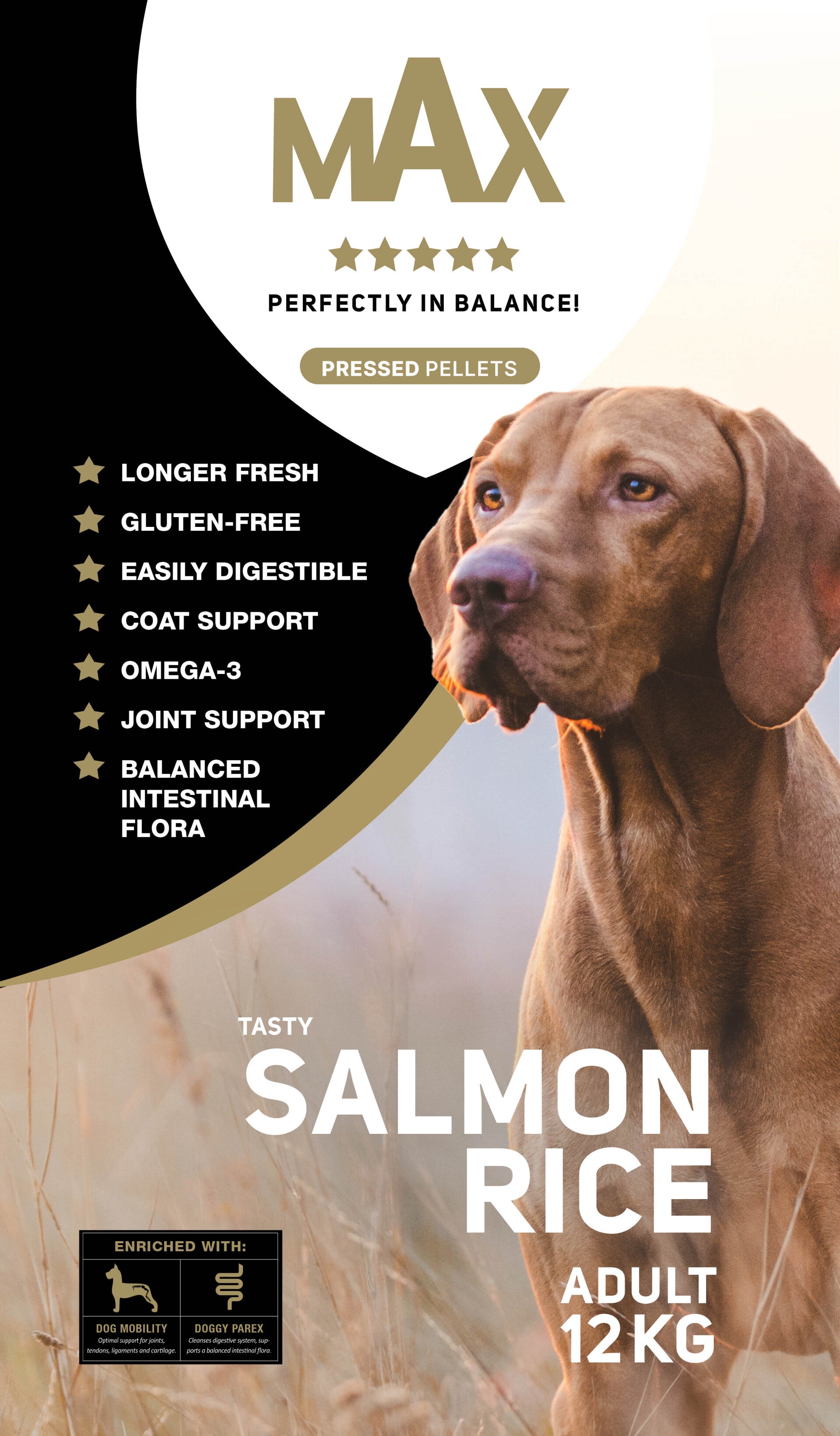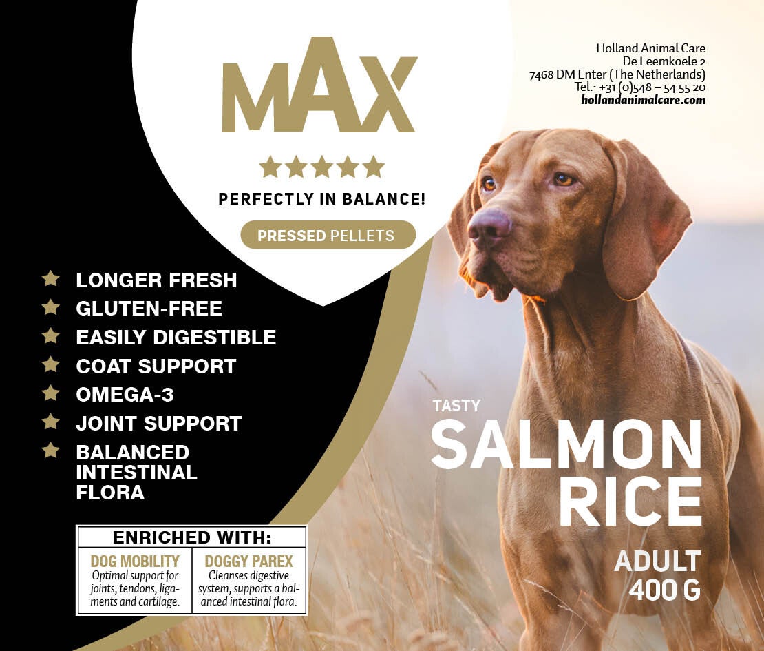 Max Adult Saumons et riz en morceaux pressés est un aliment 5 étoiles parfaitement équilibré pour chiens adultes sous forme de croquettes pressées. Il aide les chiens adultes à rester parfaitement équilibrés. Cet aliment est enrichi de 2 de nos aliments complémentaires, à savoir Dog Mobility et Doggy Parex.