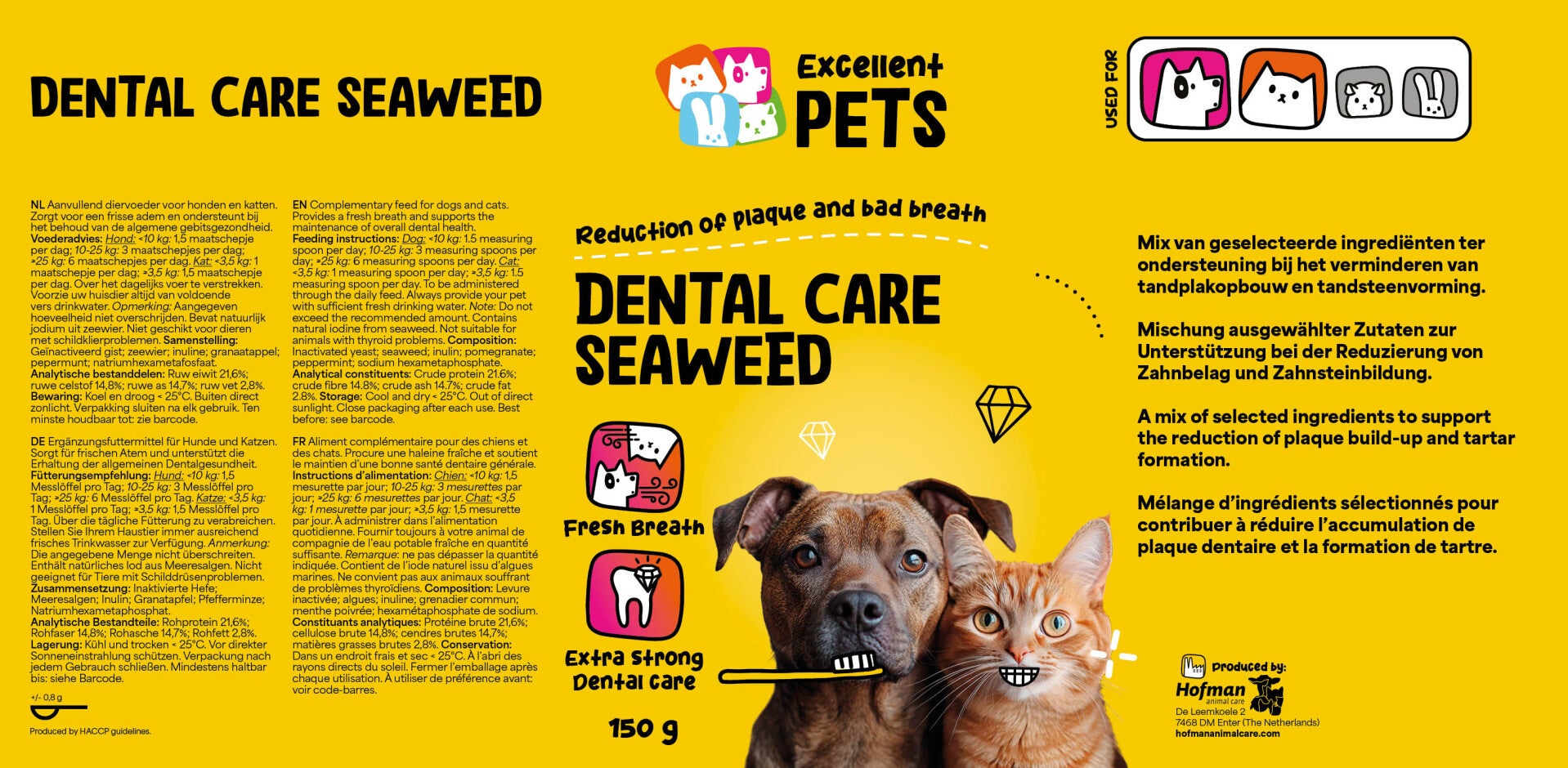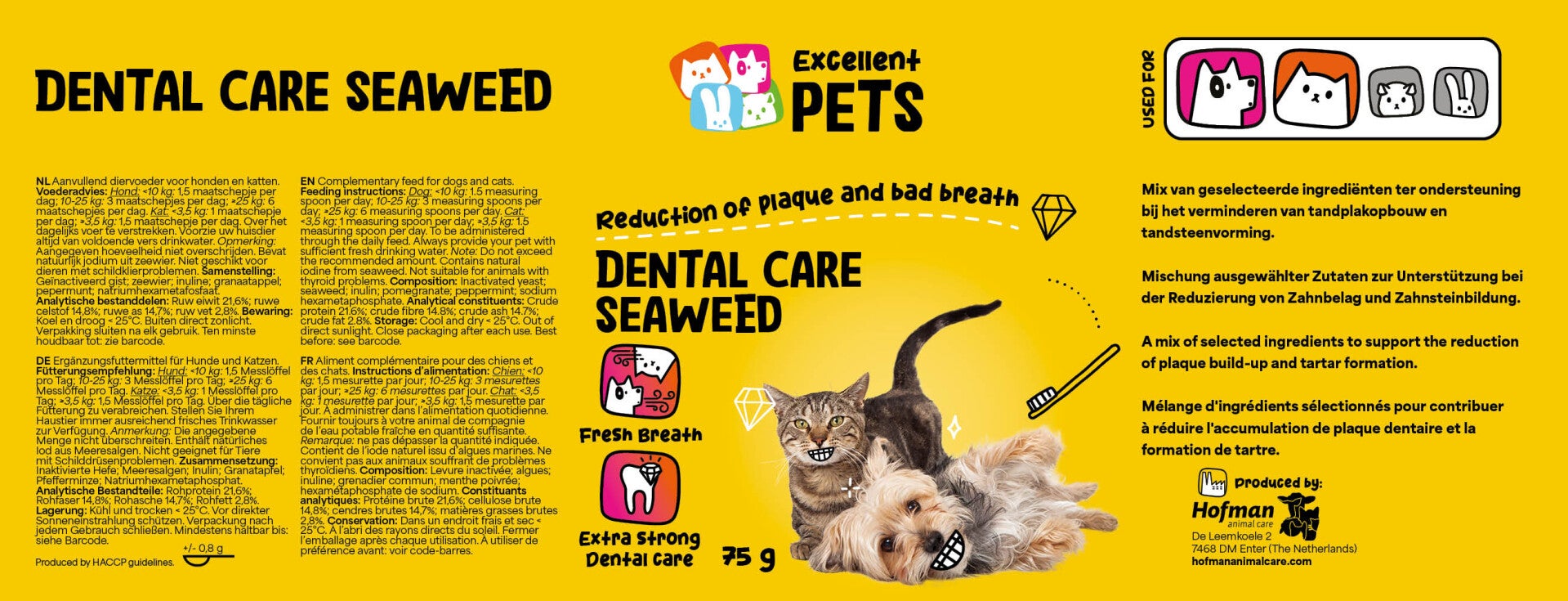 Dental Care Seaweed est un complément alimentaire pour chiens et chats, développé pour favoriser la santé des dents et des gencives. Le mélange d'ingrédients soigneusement sélectionnés aide à réduire la formation de plaque dentaire et de tartre, favorise une haleine fraîche et contribue à la santé dentaire globale.