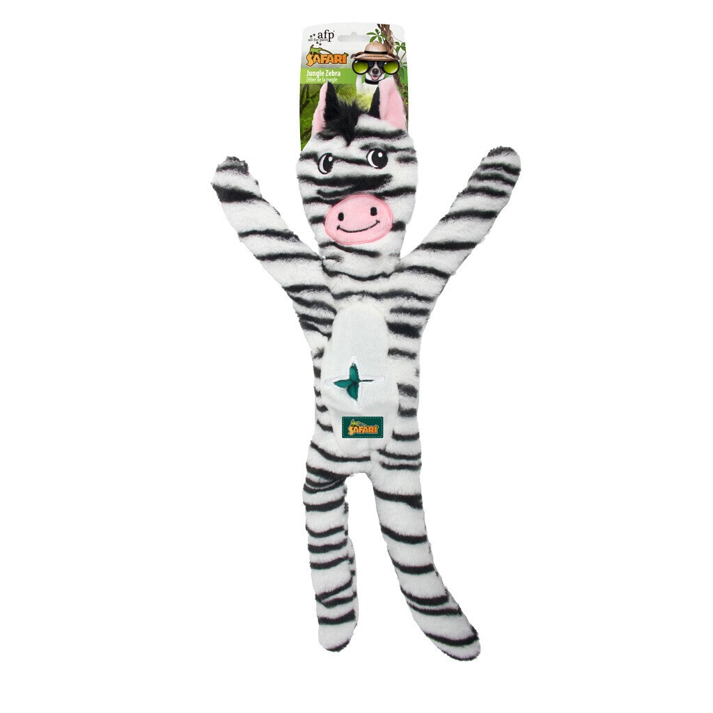 Des peluches résistantes de la jungle. Ils ne sont pas remplis, ce qui évite les dégâts au cas où ils se déchireraient. La tête est munie d'un couineur et le corps est recouvert d'une corde en filaments de soie que les chiens adorent ! Les peluches AFP Safari ont de longs bras et de longues pattes pour le plaisir de secouer et de tirer.