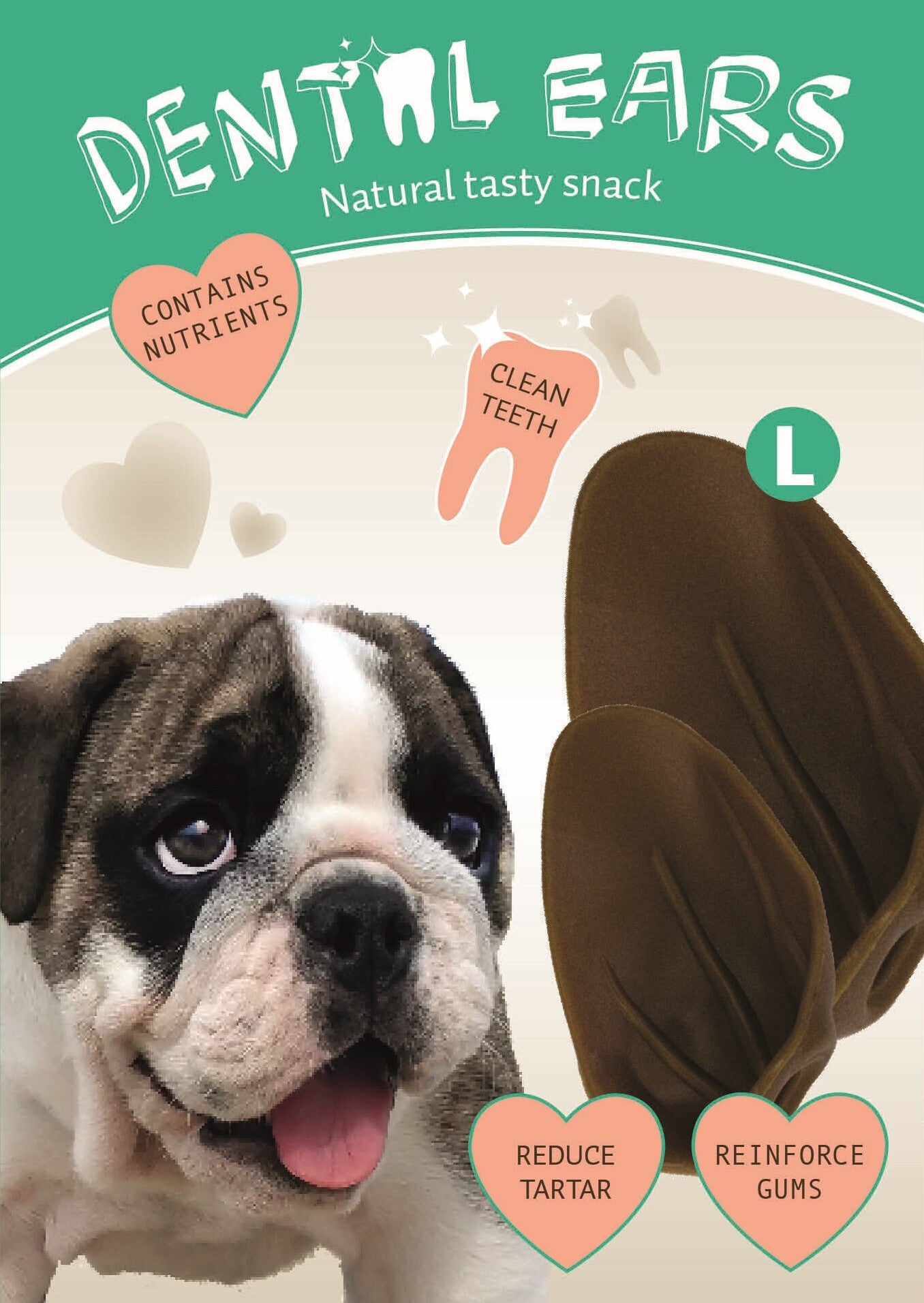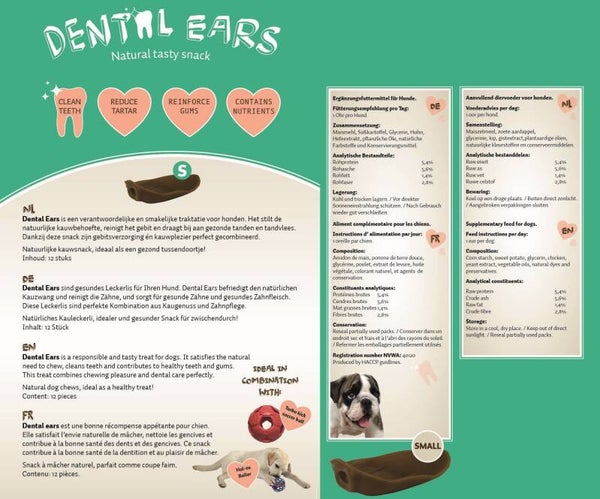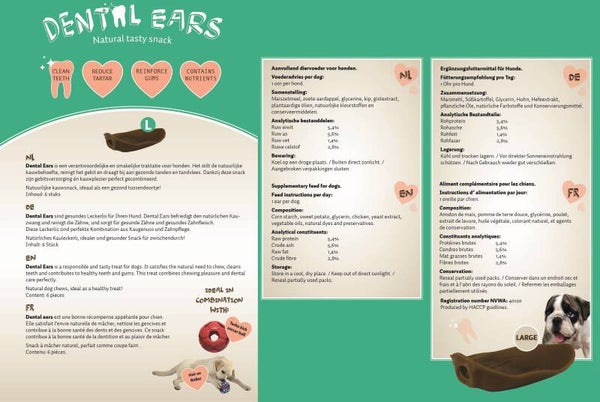 Les Dental Ears sont des friandises raisonnables et savoureuses pour les chiens. Elles répondent au besoin naturel de mâcher, nettoient les dents et contribuent à la santé des dents et des gencives. Grâce à cet en-cas, les soins dentaires et le plaisir de mâcher sont parfaitement combinés.